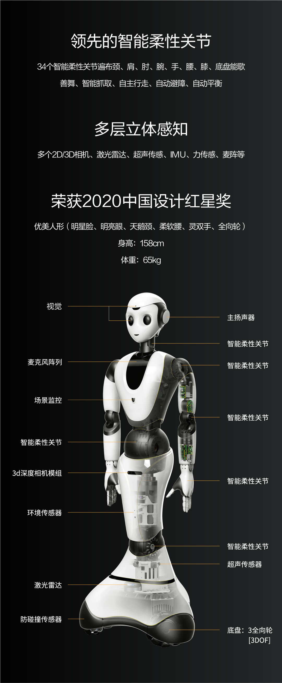 34個智能柔性關節遍布頸、肩、肘、腕、手、腰、膝、底盤