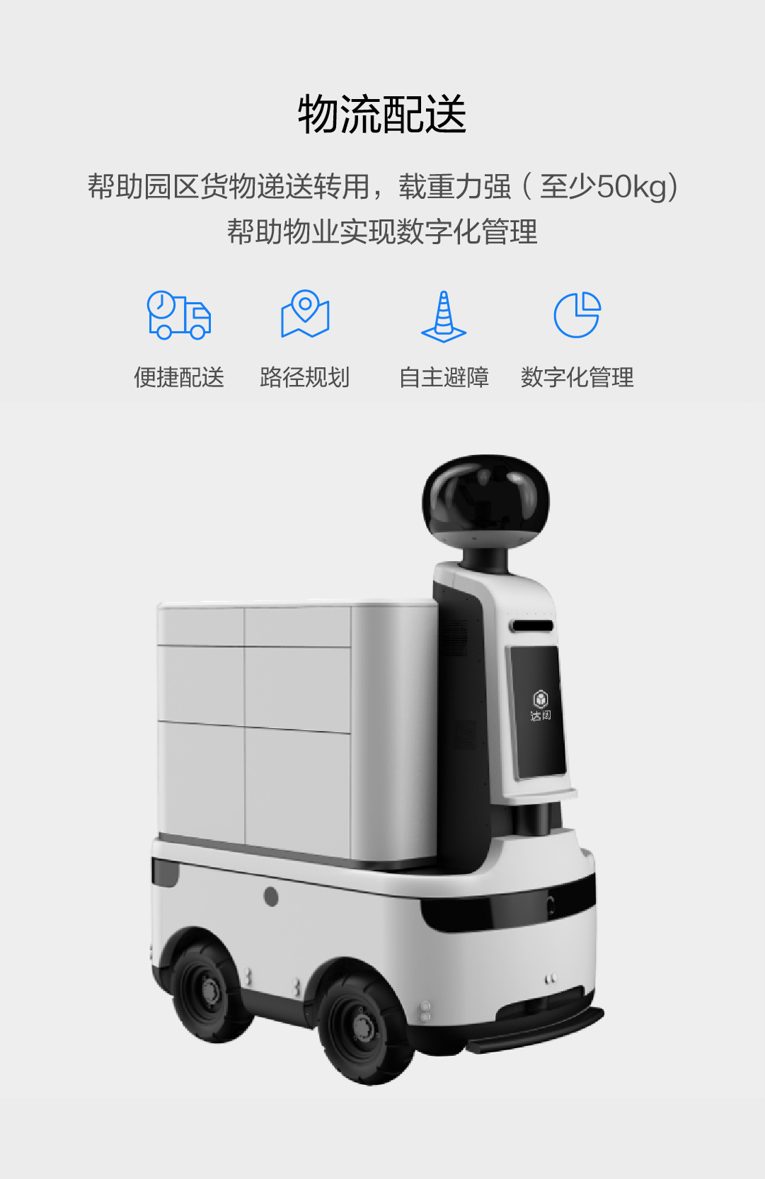 能幫助園區(qū)貨物遞送轉(zhuǎn)用,載重力強(qiáng)(至少50kg) ,幫助物業(yè)實現(xiàn)數(shù)字化管理